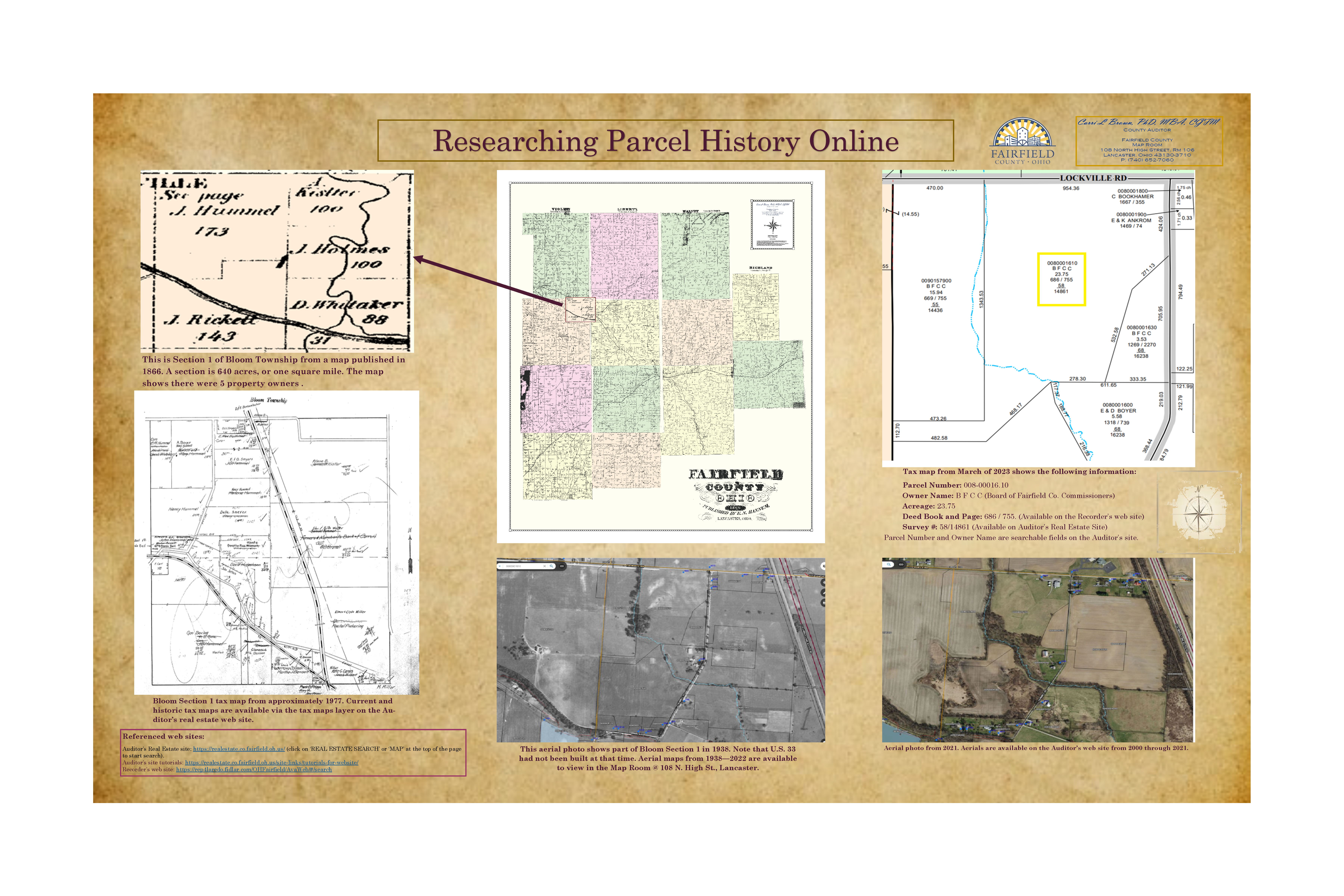 The August Map of the Month highlights the websites available to research a parcel’s history. Owner information, aerial maps, surveys, tax maps, and recorded deeds are part of the vast amounts of data available online. The map features examples of different maps accessible.