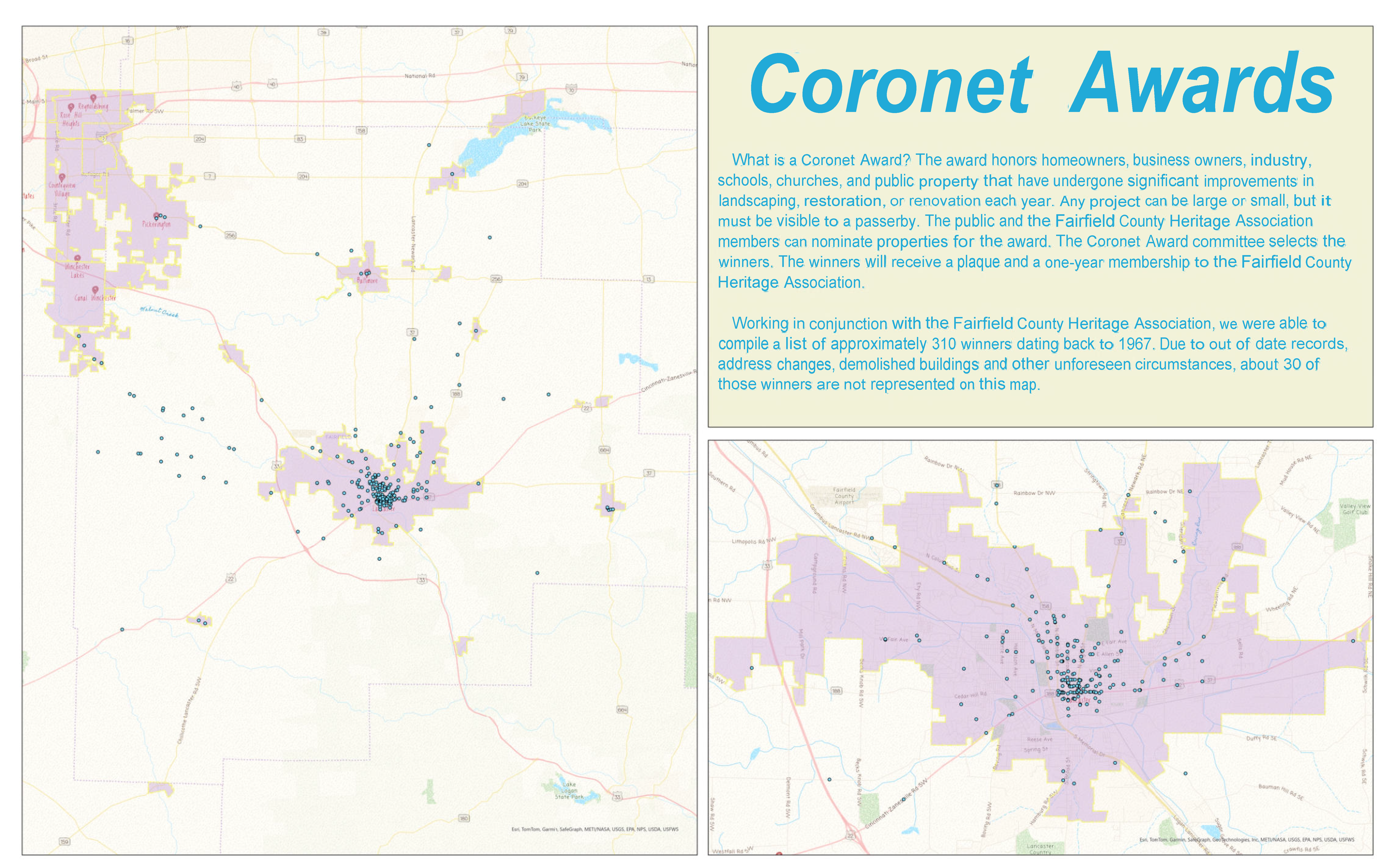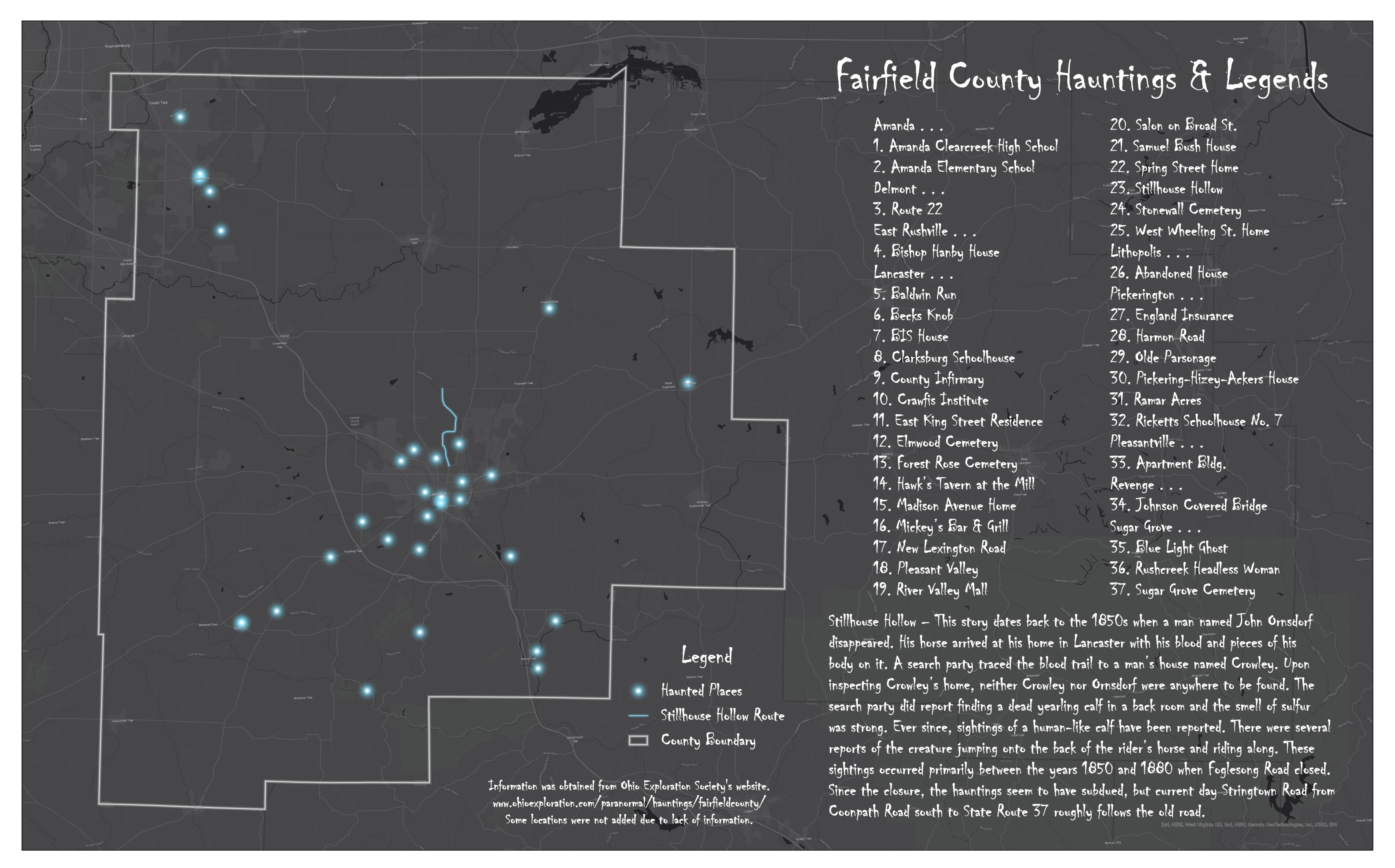 The Baldwin Inn was once located at the corner of Route 188 and Marietta Road on the east side of Lancaster. In 1936, Lewis Cook of the Lancaster Eagle Gazette highlighted the property and its spooky history (included on the map). This map was completed last year after October had already passed. Curt Truax and Nick Dilley (formerly with the GIS office) worked on this together before Nick left for the Engineer’s Office.