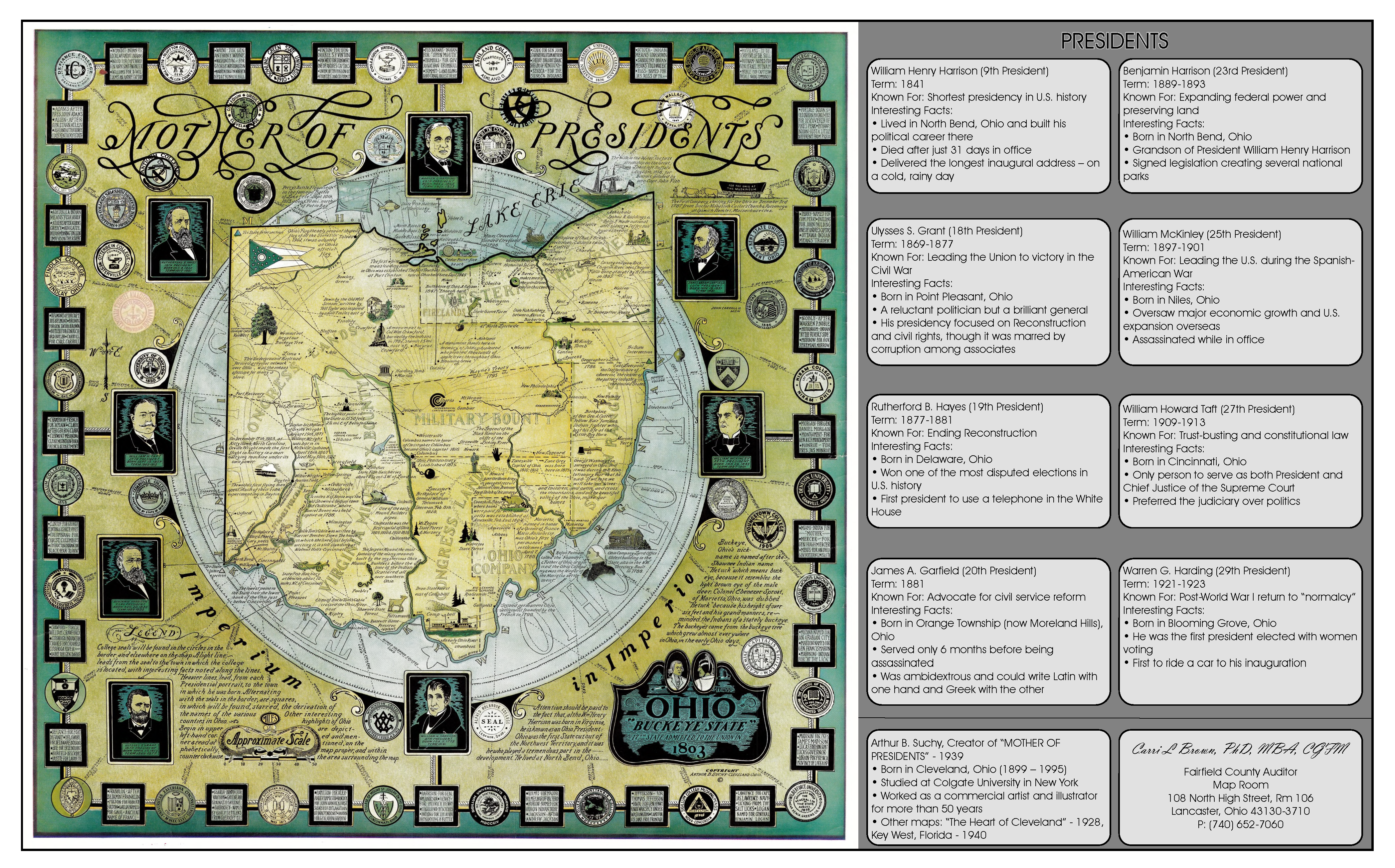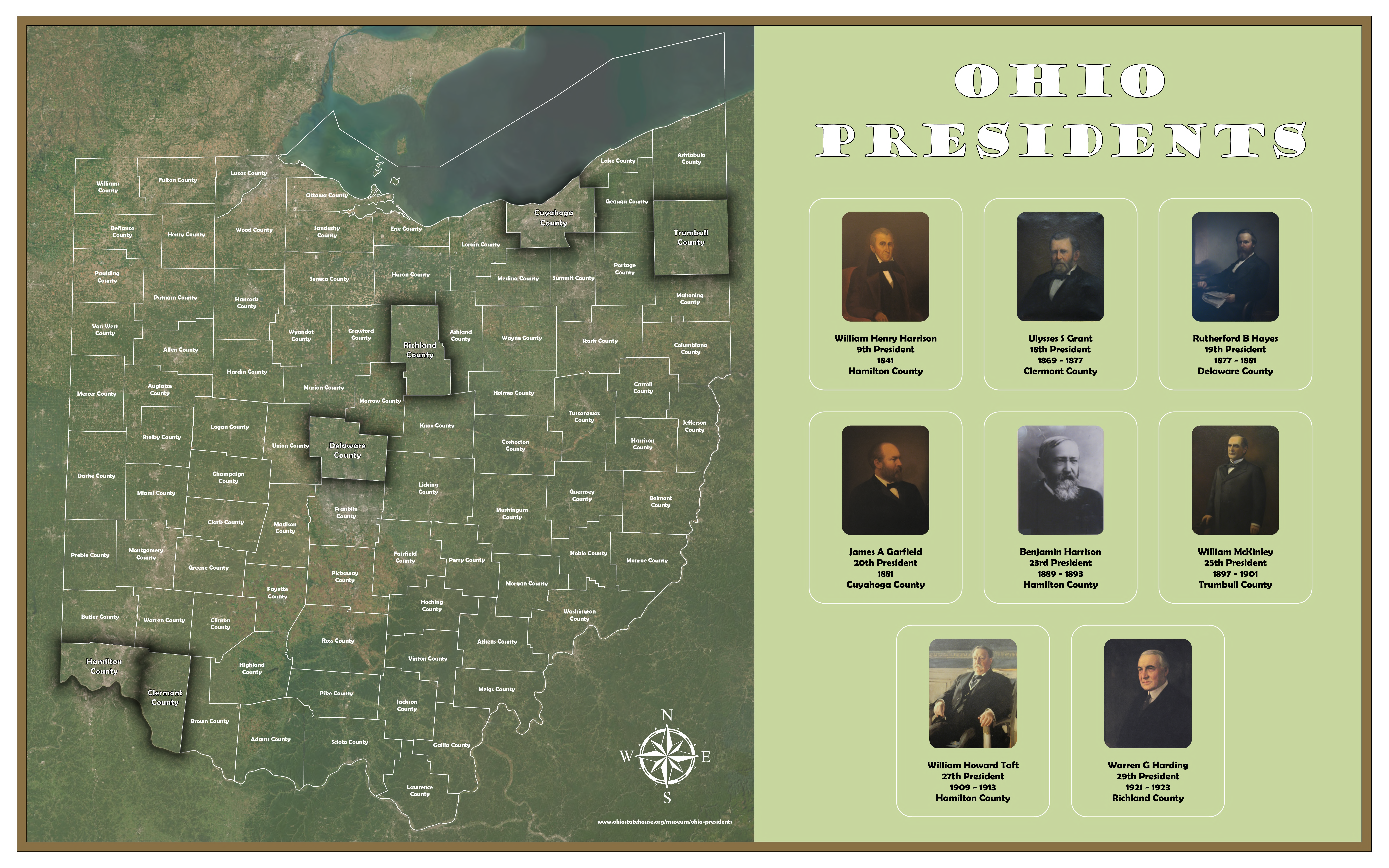 This map features seven U.S. Presidents born in Ohio, plus William Henry Harrison—born in Virginia, but a resident of Ohio from 1812 on. Thank you to Nick Dilley for creating this map before he headed to the Engineer’s Office.