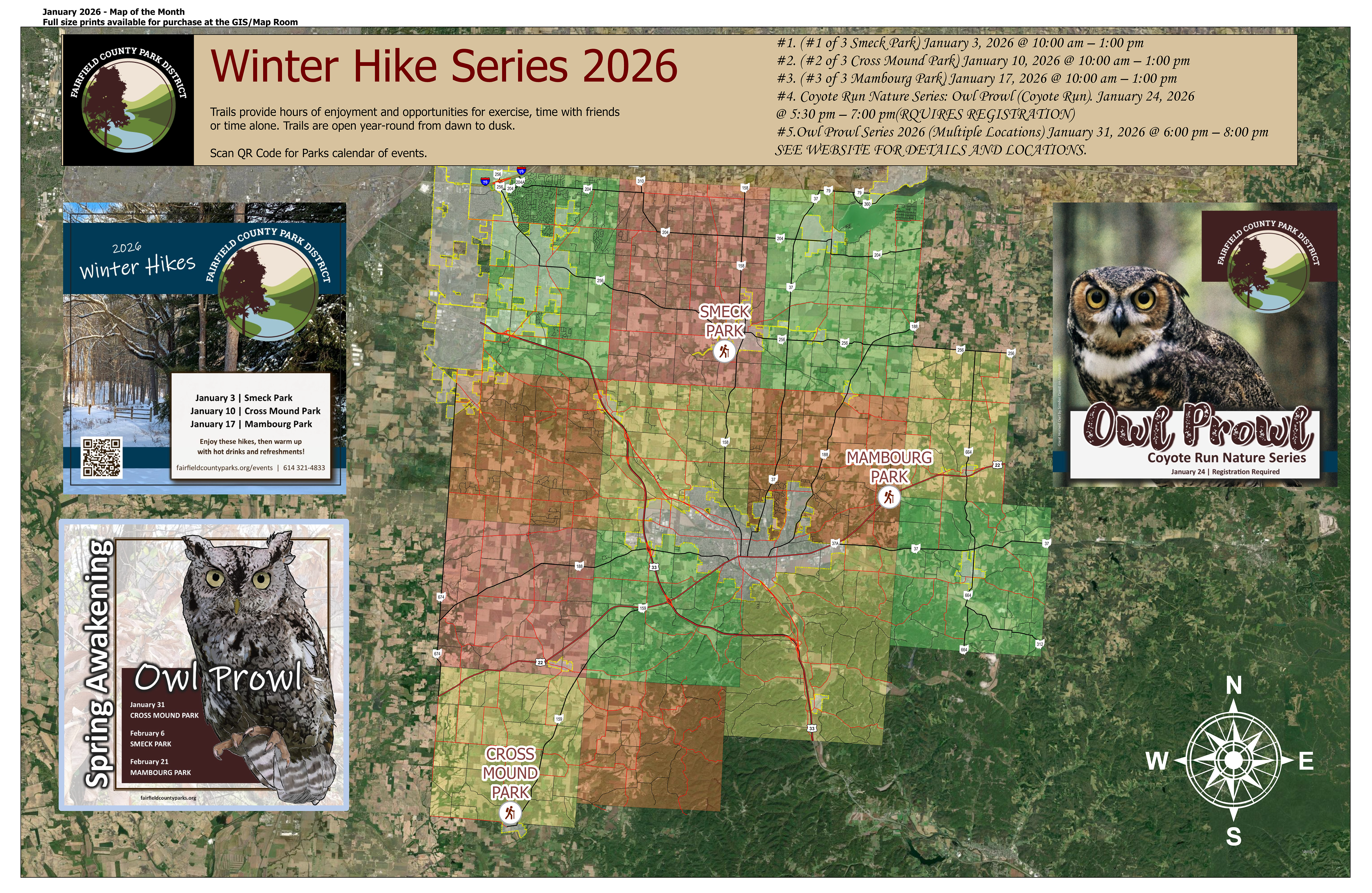 This map features the Fairfield County Parks District’s 2026 Winter Hikes Series. There were five hikes planned in the month of January.