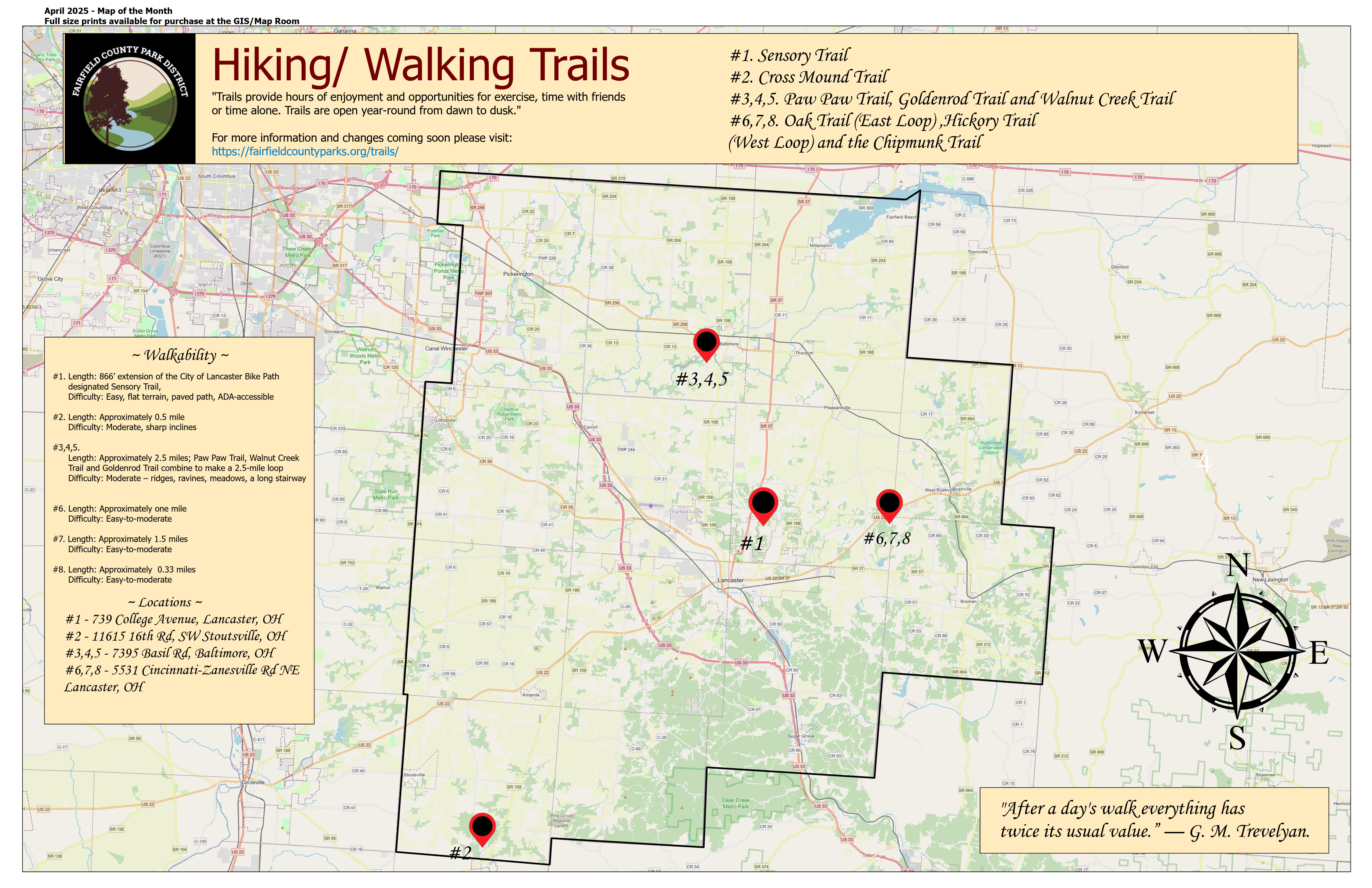 Perfect for the arrival of warmer days—this map shows hiking and walking trails across the county, including locations, lengths, and difficulty ratings. There are eight different trails at four locations. Happy hiking!